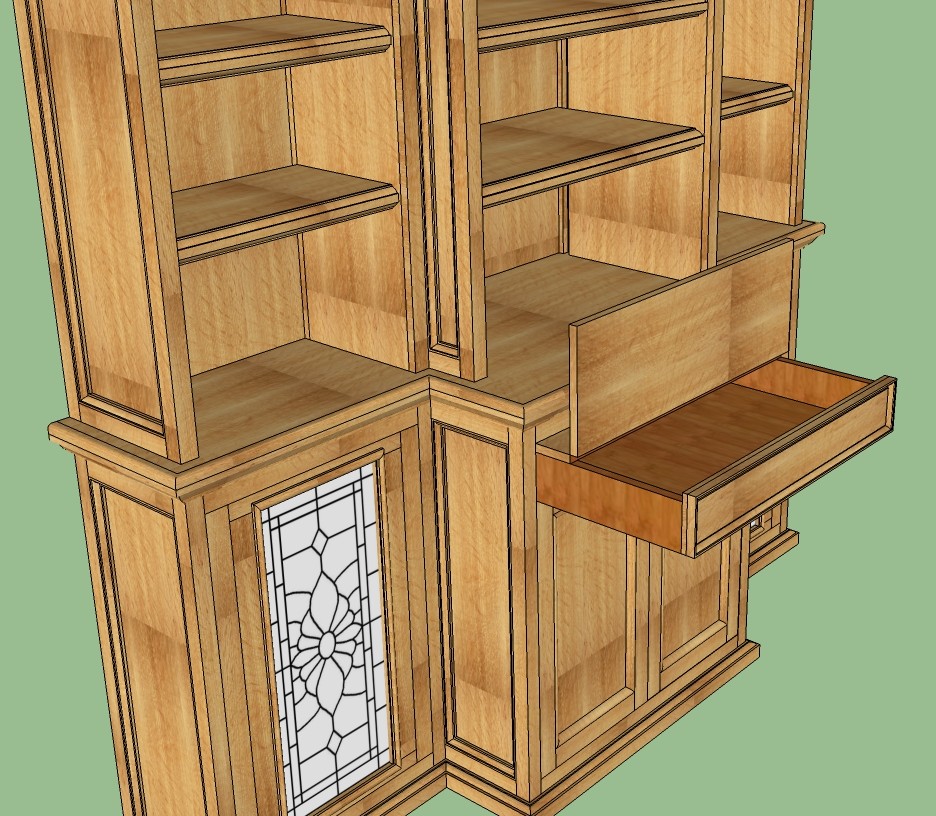 The lower middle cabinet has a drawer that when opened can serve as a "desk".