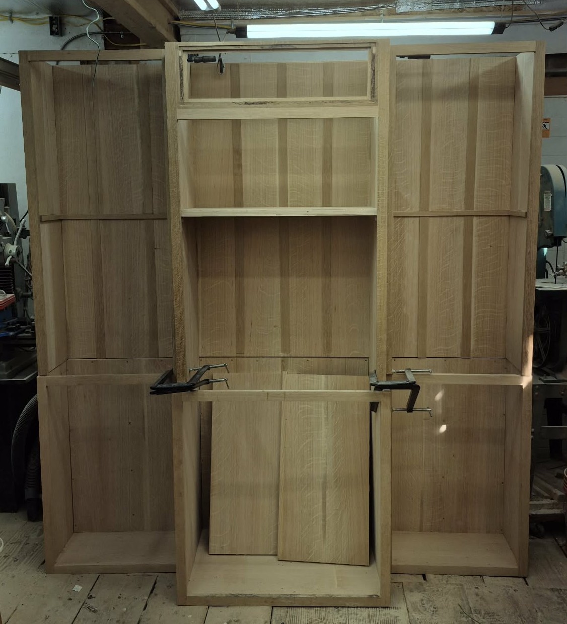 The main panels are complete and glued in place. The six individual cabinets are loosely clamped in place. Still have the shelves for the two side cabinets to press and install, then it's on to the doors. Then the base, the mid and upper crown moldings